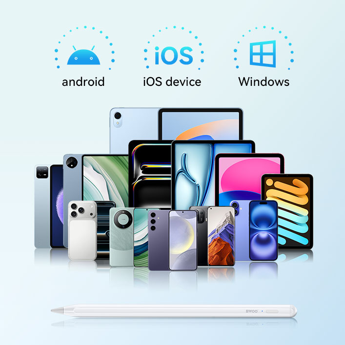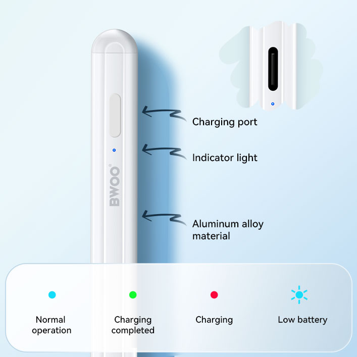 The built-in LED indicator light provides real-time status reminders, letting you check power and working mode at a glance. With a long-lasting battery and 30-minute full-charge time, the BWOO stylus ensures continuous productivity throughout the day. Durable, reliable, and easy to use for students, creators, and professionals.