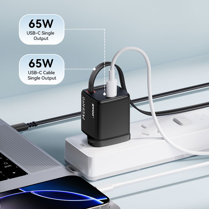 The BWOO 65W GaN charger delivers strong and efficient power for laptops, tablets, and smartphones. With upgraded output, it supports fast charging for high-demand devices while maintaining stable and reliable performance.