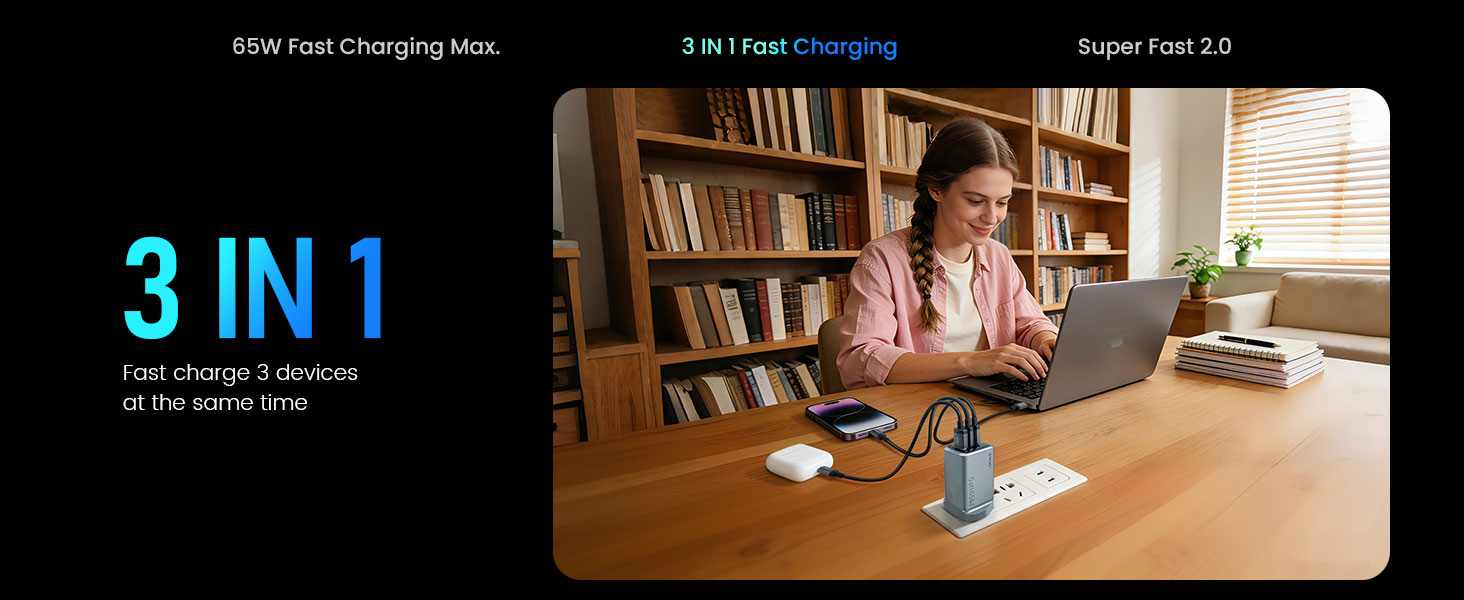65W PD Fast Charging: Delivers high-speed charging for laptops, tablets, and phones