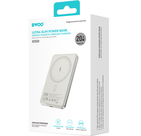 BWOO 5000mAh Magnetic Power Bank Ultra-Slim engineered with a 20W fast charging output to deliver quick and efficient power wherever you are. Its built-in magnetic wireless charging feature attaches securely to your phone, ensuring stable charging without interruptions.